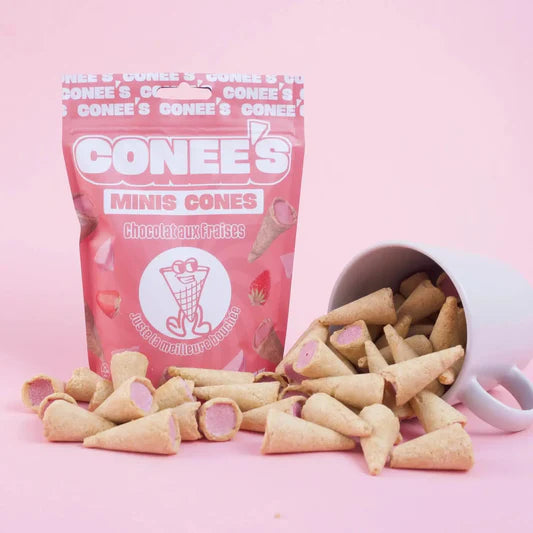 Lorsqu'on mange un cône glacé, on adore arriver à la fin dû cône pour déguster la gaufrette et son intérieur au chocolat. Avec la marque Conee's, plus besoin de devoir manger une glace entière ! Les Conee's Chocolat au Lait sont de petites gaufrettes en forme de cônes glacés avec un délicieux chocolat au lait à l'intérieur.